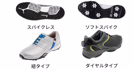 ソールに凹凸のあるスパイクレスシューズと、非常にグリップ力が高いソールに鋲のついたソフトスパイクタイプがある。