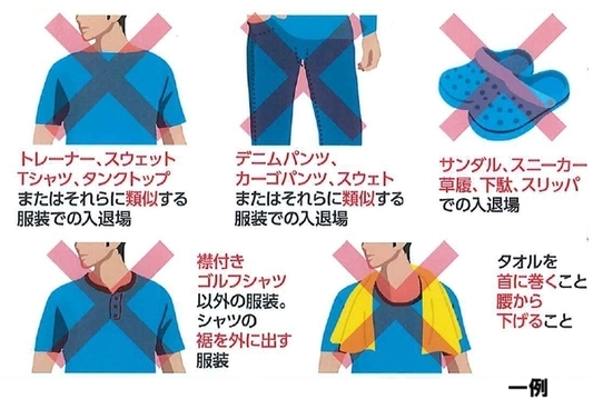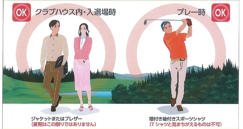多くのゴルフ場ではドレスコードがあり、襟付きシャツ、チノパンやゴルフ用パンツが基本となります。ゴルフ場によっては細かな決まりがあるコースもありますので事前にゴルフ場ホームページ等で確認しましょう。季節に応じた重ね着や、雨具も用意しておくと安心。また、ジャケット着用やデニム生地(ジーパン等)NGなど、ゴルフ場クラブハウス内での服装にもドレスコードがあります。こちらも事前に確認しておきましょう